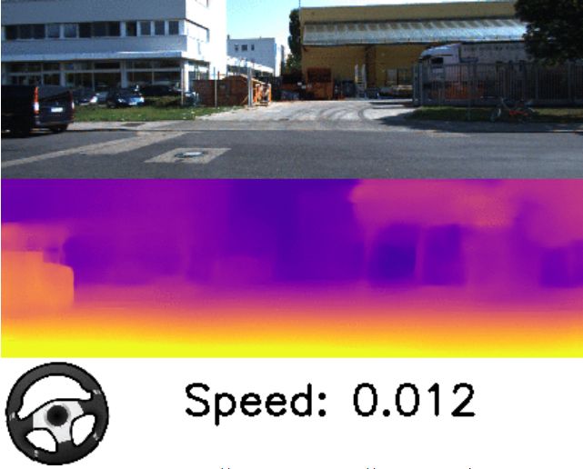 深度和自我运动预测。跟随速度和转向角度指示观察汽车转向或停下来等红灯时的估算值