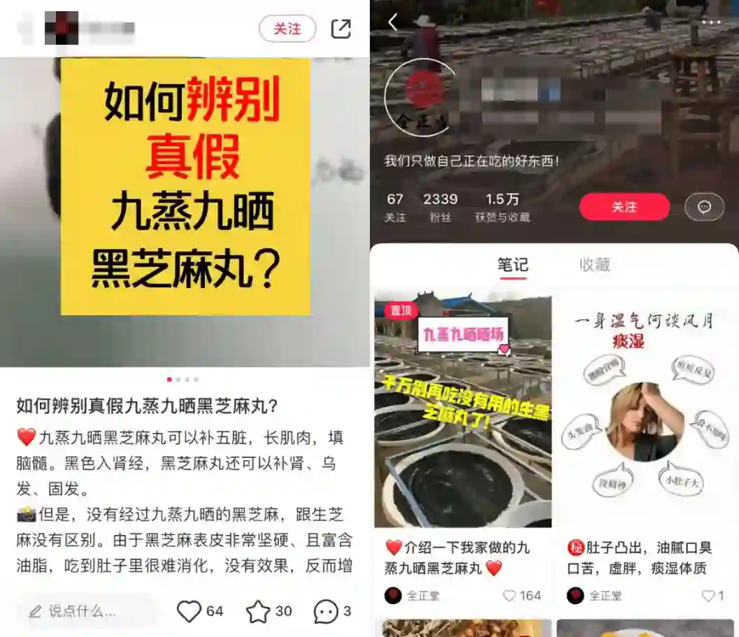 那些表面是在图文并茂的科普“古法”九蒸九晒,实则点进主页,拉到最后,还是在卖自己搓的黑芝麻丸。