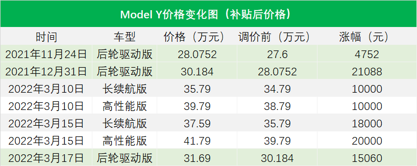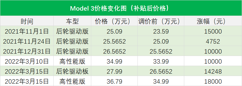 3月10日到3月17日,短短8天时间,特斯拉3次上调旗下产品价格。去年11月以来,Model 3后驱版涨价4次,Model Y后驱版涨价3次,两款车型配置更高的版本也已涨价2次。