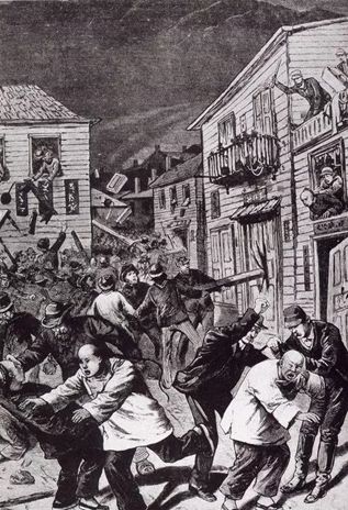 从1871年开始,白人劳工实施了多起针对华人的暴力行动——超过500名白人暴徒冲进洛杉矶唐人街,大开杀戒,18名华人遇害,被吊在街头暴尸。
