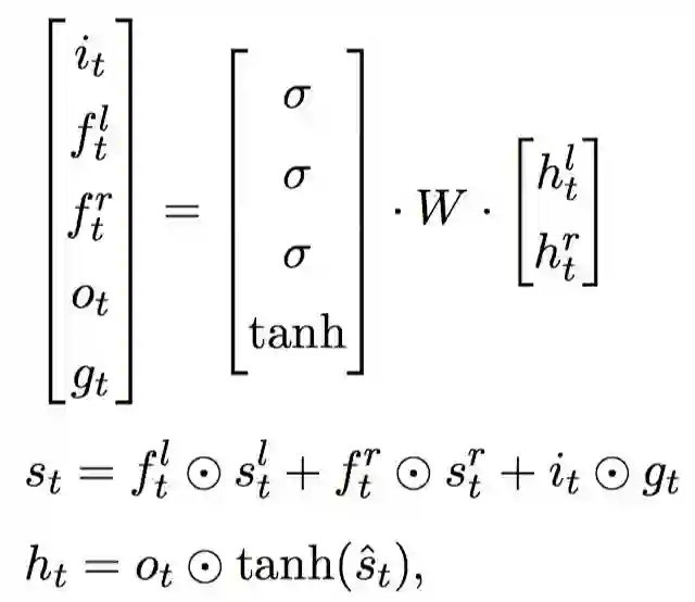 我们使用树结构LSTM对堆栈的前两个元素进行语义组合。树状结构的LSTM的定义如下: