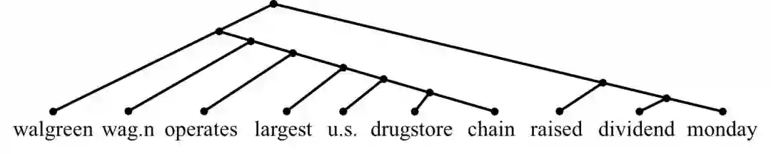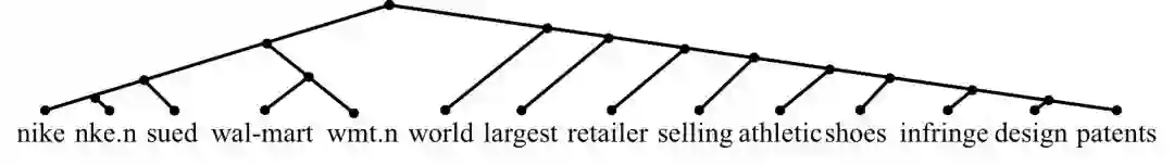 为了进一步了解我们模型生成的结构,我们检查我们的方法产生的二叉树。我们在图4给出了两个例子。对于句子"Nike NKE.N has sued Wal-Mart WMT.N, saying the world's largest retailer is selling athletic shoes that infringe on its design patents'', 句子的核心部分"Nike sued Wal-mart"以及句子的其他部分被分入两棵子树,这减少关键事件在组成句子表示时潜在的信息损失。类似地,对于句子"Walgreen WAG.N , which operates the largest U.S. drugstore chain , raised its dividend on Monday.", 模型学习到将目标"Walgreen"以及核心事件"raised its dividend on Monday"在树中的距离接近,尽管他们在顺序结构中有许多词。这些是我们的模型得到的较好的例子,我们也发现很多的树形结构是严重左倾或右倾的,这类结构等价于顺序结构中的前向和后向的长短期记忆网络。