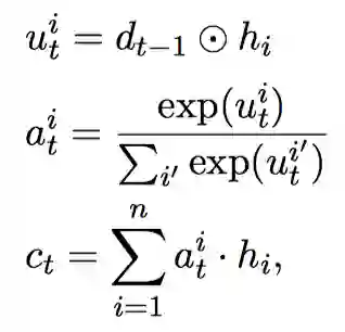 我们采用基于注意力机制的解码器。解码器将解码的每一步与编码的器的隐含状态对齐来获得上下文向量,这样输入的每个词对解码结果的贡献不同。我们将解码器的隐层状态表示为