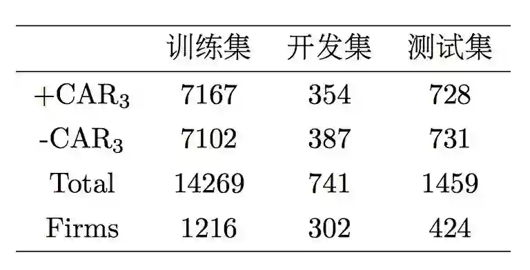 企业特定累积超额收益(CAR)预测任务致力于研究新信息对特定企业的影响。多个企业可能参与同一个新的事件,然而,事件可能会给这些企业带来不同的影响。从概念上讲,超额收益是股票实际收益与预期收益之间的差额,例如,如果一只股票预期上涨5%,但在事件当天,它上涨2%,虽然它给出了正回报,但是其超额回报为是-3%。预期收益可由每日指数(如S&P 500指数)来近似。
