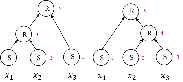 图1. 采用两种不同转移序列{S,S,R,S,R}和{S,S,S,R,R}得到两种不同的树