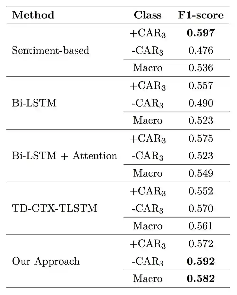 我们的方法和基线的Macro-F1分数在表2中给出。基于情感的方法在正类中给出了最高的Macro-F1得分。然而,它在负类上的表现却很差,这表明它倾向于错误地将句子归类为正类。Bi-LSTM+Attention优于传统模型,并且在正负分析中都非常稳定。我们的方法获得了58.2%的Macro-F1,在正类和负类的Macro-F1分别为57.2%和59.2%。与采用依存分析器得到树结构的模型TGT-CTX-TLSTM相比,获得了超过2%的提升。