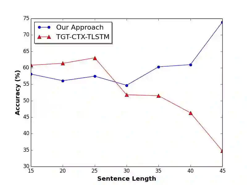 较长的句子对于句法解析器来说更具挑战性。为了深入了解我们的方法处理长句的性能,我们进一步检查了不同句子长度的准确性。如图3所示,我们与基线TGT-CTX-TLSTM进行比较。我们把句子分成七组,每组都包含长度为[5*i,5 *(i+1)]的句子。TGT-CTX-TLSTM对长度较短的句子具有较高的准确性,而对于长度大于30的句子,其准确性急剧下降。我们的方法在长句和短句上更一致。随着句子长度的增加,模型的准确率逐渐增加,显示了它在不同长度的句子中的鲁棒性和有效性。
