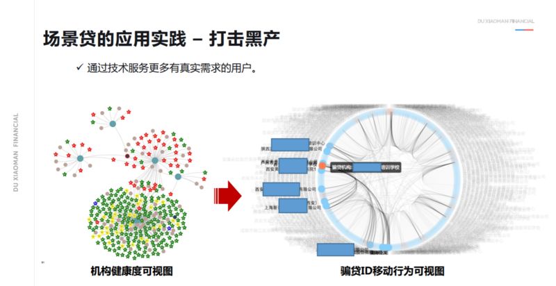 面对这个问题应该如何防范?我们可以去甄别出存在异常行为的用户,发现存在欺诈的机构或用户,可以及时地进行处理和关停。关停以后,我们发现了一个有意思的现象:被处理的这些欺诈用户,又流转到其他的机构,呈现出一个用户之间流转的分布图,重点排查这些用户,就可以及早预防新的欺诈出现。结合这些技术可以有效的去控制整个产品方面的风险,在控制欺诈风险以后,就可以给产品用户提供非常优质的服务。