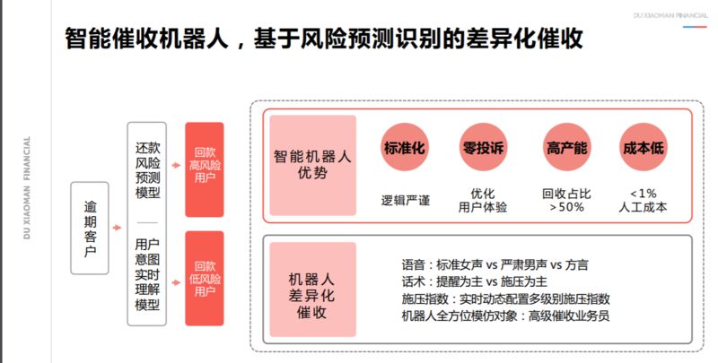 所以这个行业的人员也是很难受的,催收人员有的时候还会出现话术不够标准化,没有严格按照要求去执行的情况发生,同时情绪上还经常会出现波动。但机器人不会存在这个问题,机器人不会存在情绪波动,它会非常严格地按照已经定义好的方式去执行,所以机器人相对人类而言,标准化做得非常好,逻辑严谨,不用担心出现什么违规的现象。