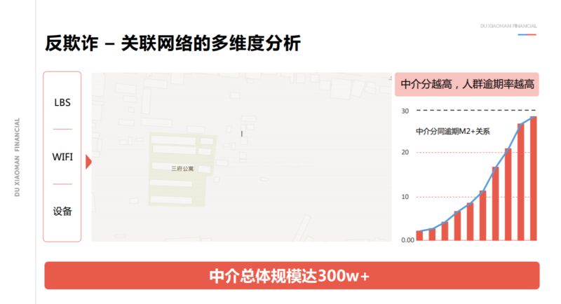 第二个问题是:在欺诈过程中存在一些称之为“金融中介”的群体,而他们实际上是做了信息差的生意。有两类是金融中介服务的人:一类是缺乏了解各种信贷渠道的人,他们不知道这信息,所以需要金融中介提供服务,在中间收取服务费;另外一类是某个人的信用记录已经很差,需要中介帮他去包装、造假,欺骗对应的金融机构,而在这个过程中,“黑中介”一般要收收取 10% 到 20% 的佣金,资质差的甚至要收到 50%,这类中介是非常恶劣的。