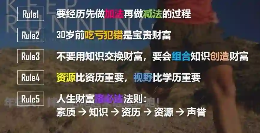 刚才前面讲到,30岁之前多去尝试多犯错,找到一条正确的路,这些经验就会成为将来的宝贵的财富。