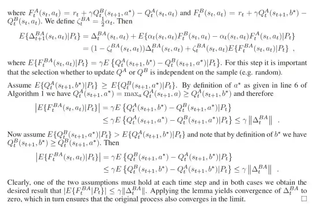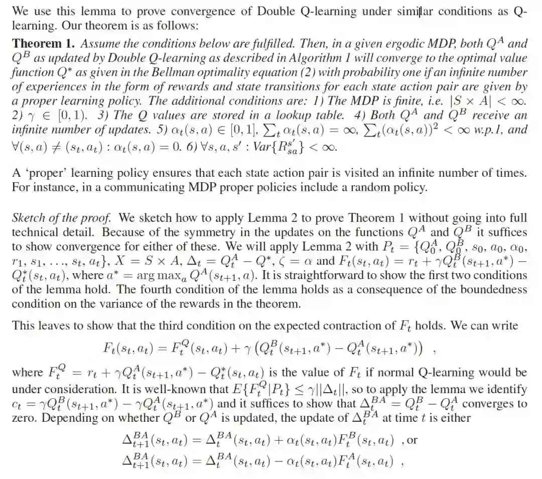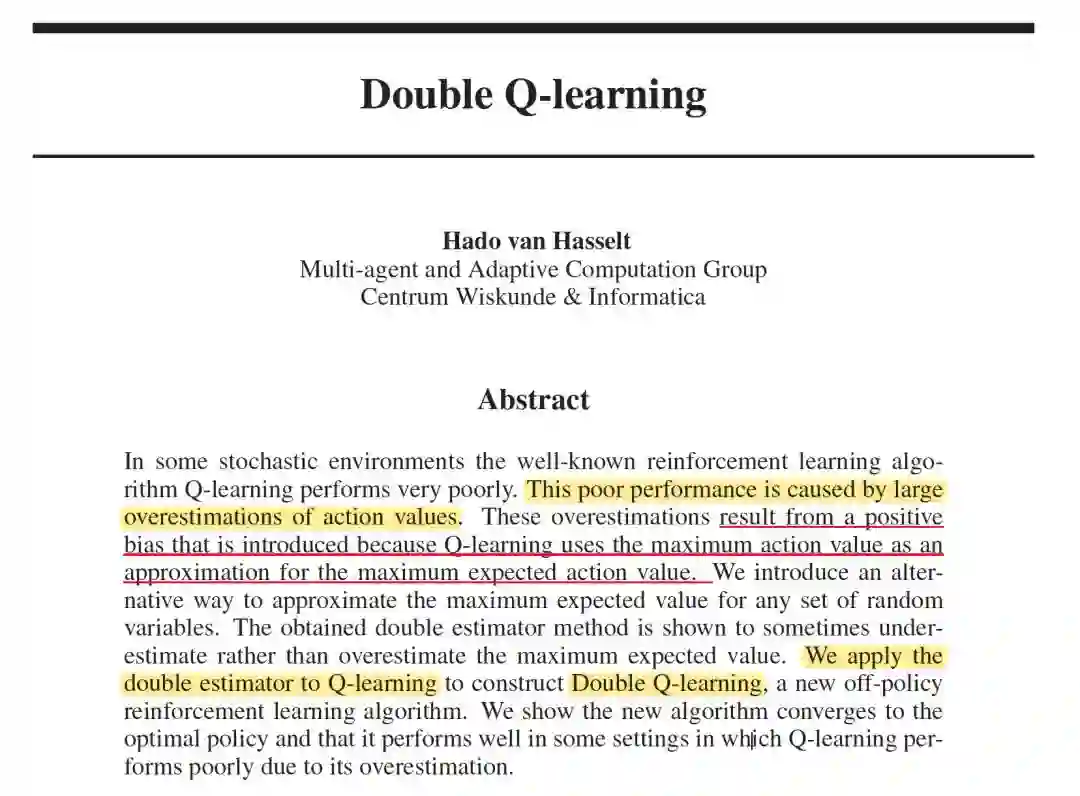 前言: Q-Learning算法由于受到大规模的动作值过估计(overestimation)而出现不稳定和效果不佳等现象的存在,而导致overestimation的主要原因来自于最大化值函数(max)逼近,该过程目标是为了最大的累计期望奖励,而在这个过程中产生了正向偏差。而本文章作者巧妙的是使用了两个估计器(double estimator)去计算Q-learning的值函数,作者将这种方法定义了一个名字叫“Double Q-learning”(本质上一个off-policy算法),并对其收敛过程进行了证明(缺点:当然double Q-learning算法有时会低估动作值,但不会像Q学习那样遭受过高估计)