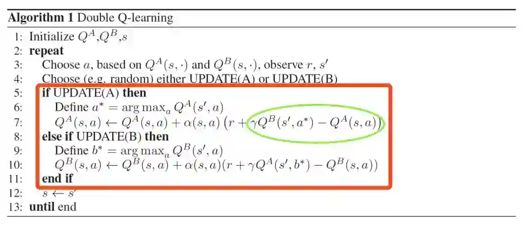 函数都必须从不同的经验集中学习,这一点很重要,但是要选择要执行的动作可以同时使用两个值函数。 因此,该算法的数据效率不低于Q学习。 在实验中作者为每个动作计算了两个Q值的平均值,然后对所得的平均Q值进行了贪婪探索。算法伪代码如下: