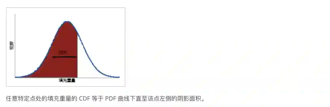 例如,罐装苏打水的填充重量服从正态分布,且均值为 12 盎司,标准差为 0.25 盎司。概率密度函数 (PDF) 描述了填充重量的可能值的可能性。CDF 提供每个 x 值的累积概率。此处参考PDF-CDF指导