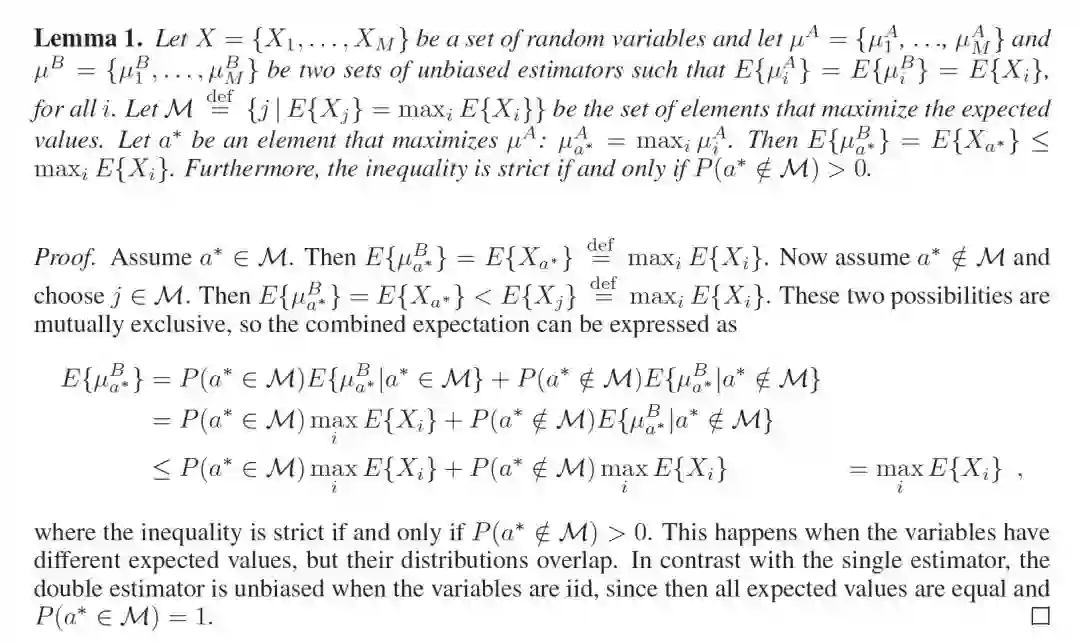 对于任意的 来说,最优值函数 的更新依赖于 , 从公式中可以看出,我们把N个Q值先通过取max操作之后,然后求平均(期望),会比我们先算出N个Q值取了期望之后再max要大。这就是overestimate的原因。