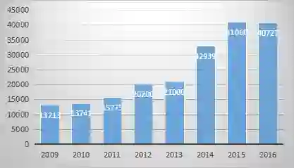 2009-2016年全球专业服务机器人销量(单位:台)