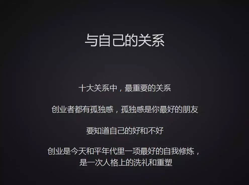 只要创业不停歇,就很难彻底平衡家庭关系,这导致大部分创业者的内心很痛苦,所以千万不要小看睡在你身边的人,一定要等遇到一个志同道合的、更懂你的人再结婚。