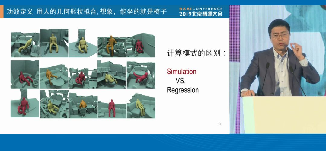 这时椅子就变成了一个任务等价类,不管什么物体,能够坐、坐得舒服的就是椅子。这也代表了一种想象:这把椅子怎么坐,这和深度学习是不同的:Regression拿特征去拟合,是一种统计,而Simulation 是得用身体去想象,这两者有着根本区别。