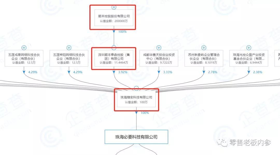 《零售老板内参》通过企查查了解毕胜名下的“珠海必要科技有限公司”股权穿透图时发现,顺丰控股旗下的深圳顺丰泰森控股(集团)有限公司,占据必要商城3.92%的股份,认缴金额为11.45万元。据知情人士透露,王卫是想通过必要商城,再造顺丰商业的另一只抓手。
