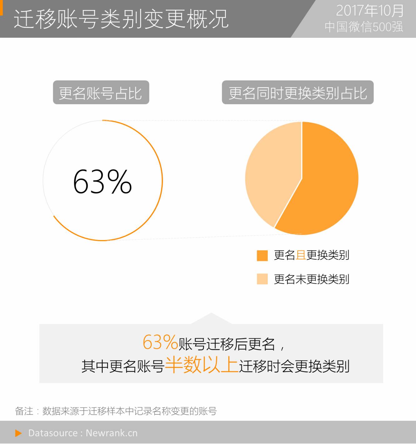 在上述已纳入新榜日常采集的867个公众号中,63%账号在迁移后选择更名,而在更名的账号中有58 %同时变更了类别,既更改名称又变更类别占全样本逾36%,可大致推断约三分之一的的账号迁移后进行了转型。(注:由于公众号类别可人为修改,并不能完全反映公众号的类型特征,因此在此统计中,掺杂了人为主观因素的影响)