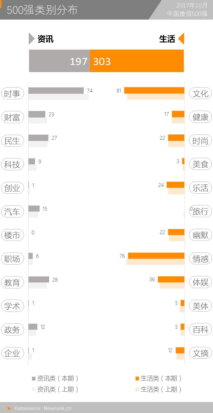 500强中强类别三甲依次为:文化(81)、情感(76)、时事(74);其中,文化类增加4席,反超本月环比减少7席的时事类,成为第一强类别;资讯类和生活类席位占比约为2:3,资讯类整体减少8个。