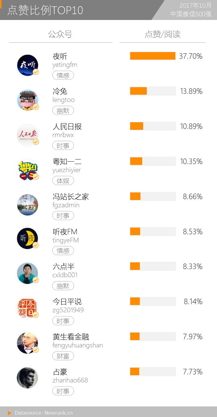 本月点赞比TOP10中出现一位新面孔,为“粤知一二”取代“河南移动”,跃居第四,“粤知一二”以粤语脱口秀为主推内容,辅以各种互动话题,面向粤语系用户,并无点赞抽奖等引导动作,但却获得10.4%的超高点赞比,约为每10个阅读收获1个点赞。