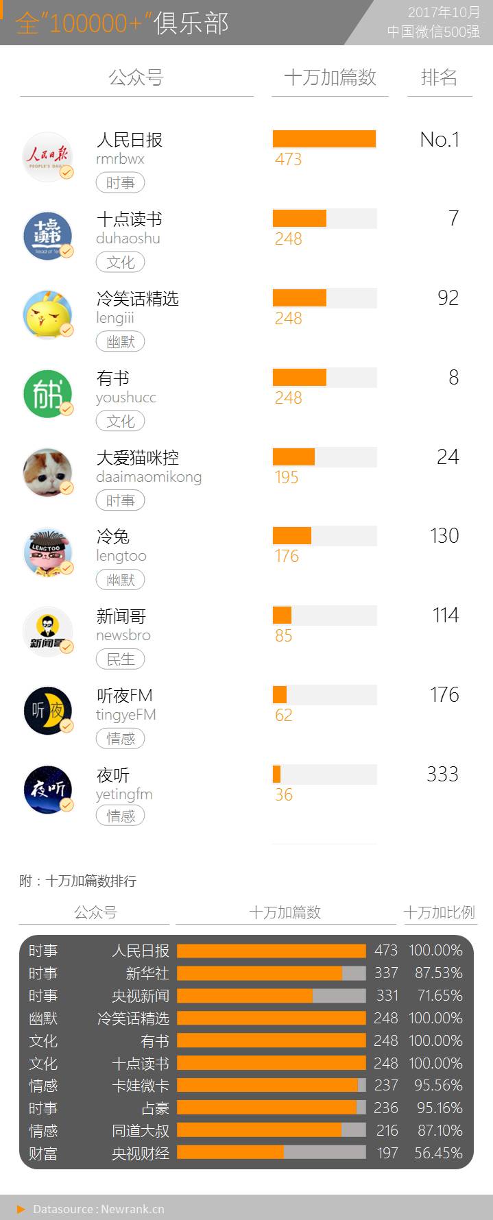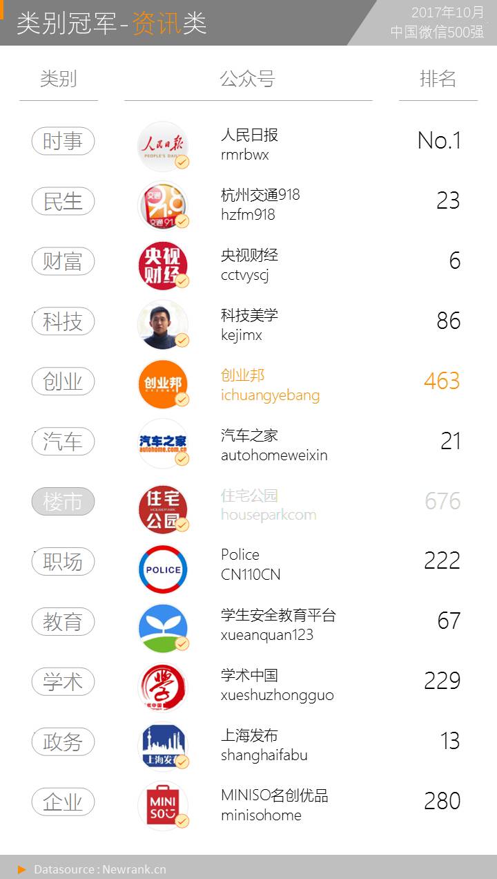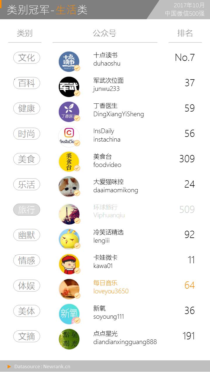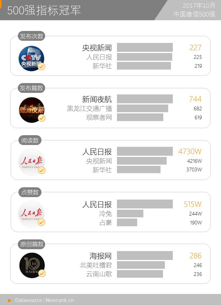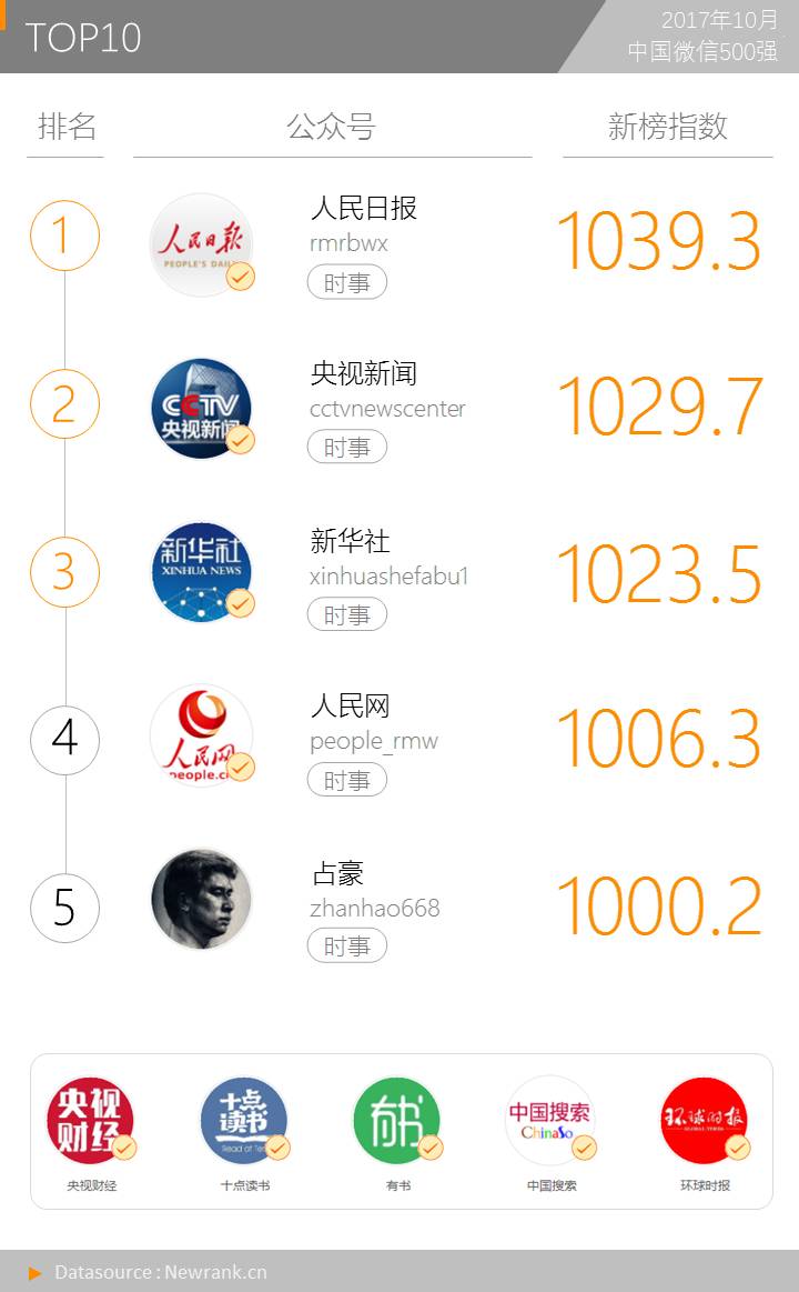 请移步"新榜排行榜"(newranklist),查看2017年10月份中国微信500强详细榜单。