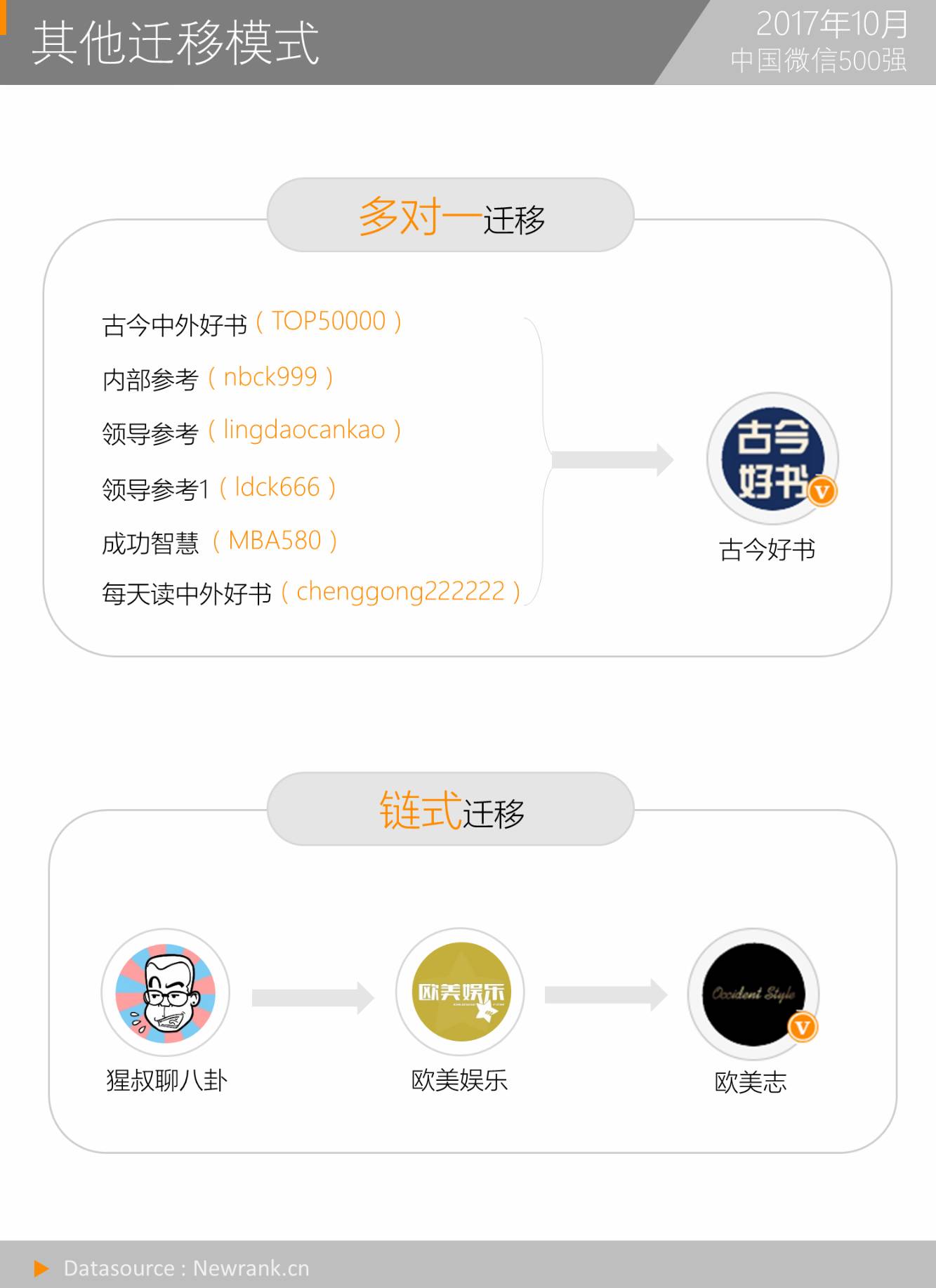 “多对一”的迁移模式中,最具代表的为“古今好书”(gjzwhs888),分别由“古今中外好书”(TOP50000)、“内部参考”(nbck999)、“领导参考”(lingdaocankao)、“领导参考1”(ldck666)、“成功智慧”(MBA580)、“每天读中外好书”(chenggong222222)六大账号迁移合并而成,为新榜统计中合并账号最多的迁移案例。值得一提的是,500强“新世相”(thefair2)也是采用了“多对一”的迁移模式,分别由“时光的情书”(sxplay520)、”曾博同学”(screader)、”犀牛阅读”(xhws8888)三个账号迁移合并。