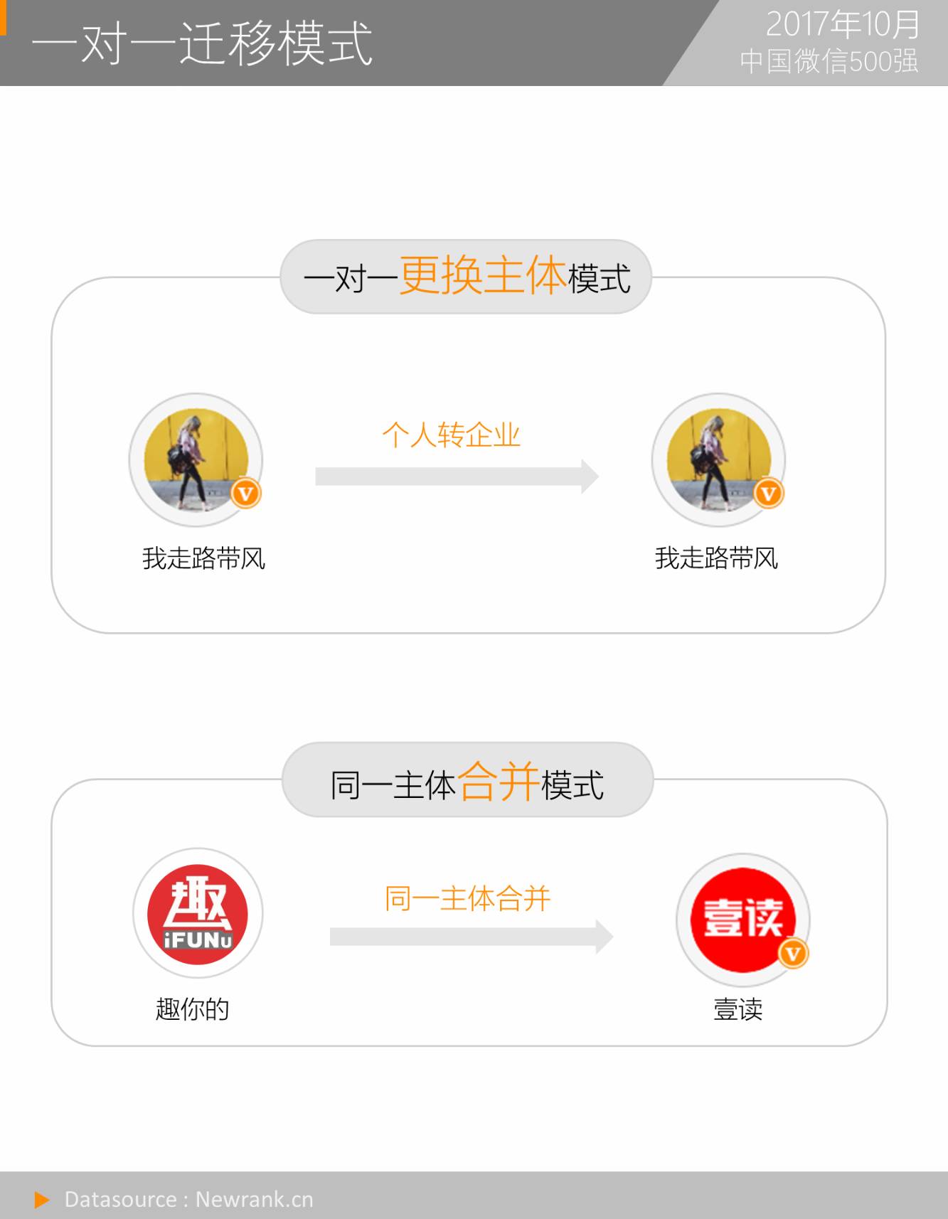 解析迁移样本的迁移路径,其中最常见为“一对一”的迁移模式,即从一个账号迁移到另一账号;但“一对一”模式所对应的情况也不尽相同,一种为个人主体账号迁移为企业主体账号,如“我走路带风”(WsFI09)从个人主体迁移到公司主体的新公众号“我走路带风”(WsFI09),该类迁移公众号名称、微信号、文章素材基本同步迁移,让粉丝的迁移差别体验最小。