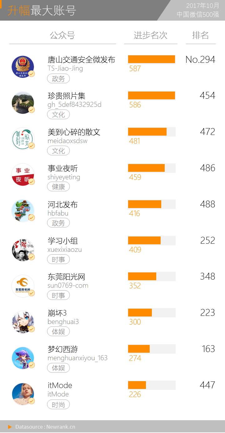 作为唐山市交警支队官方账号,“唐山交通安全微发布”提供违法查询、限行查询、实时路况等微服务,每日推送交通新闻,用心做实事,本月前进587名升至294位,跃居升幅榜首。在升幅最大的前十账号中,政务类和时事类占据四席十九大引起的持续热议不容小觑。