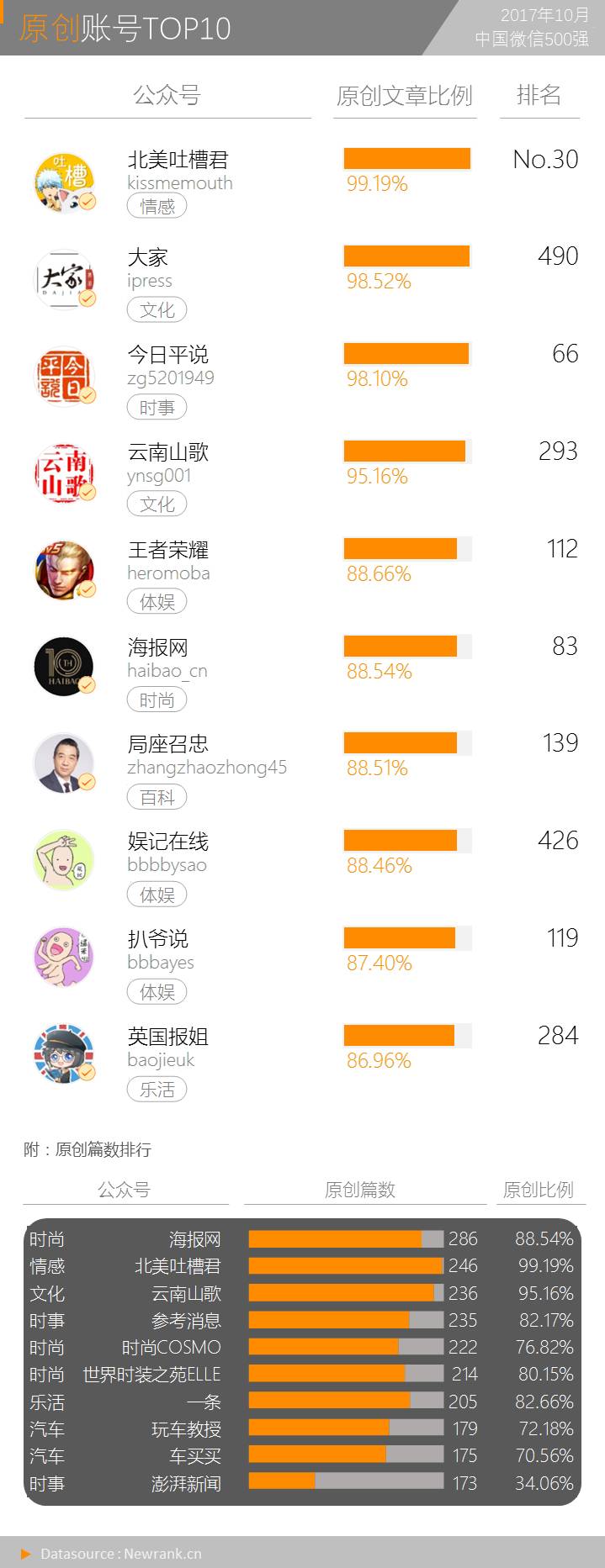 10月原创榜换员4席,为“大家”、“王者荣耀”、“娱记在线”、“英国报姐”取代“新浪娱乐”、“睡前一起夜听”、“十点夜伴”以及“星座不求人”。原创比例前十门槛较上月上升了1.4%,达到87%。