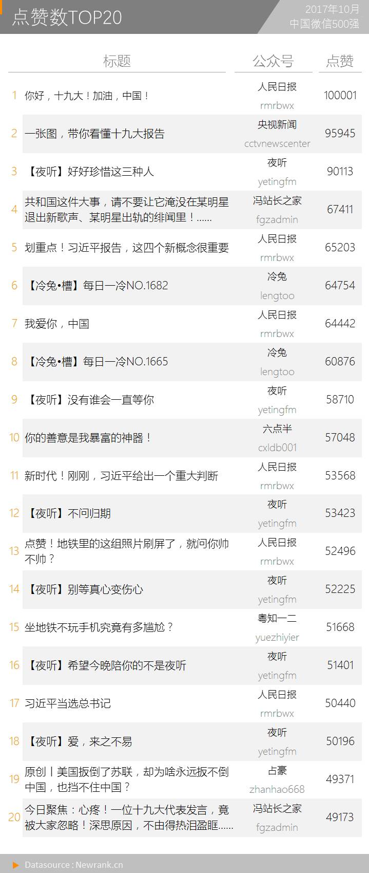 10月仅有一篇内容收获了“100000+”点赞,为“人民日报”在10月18日发布的《你好,十九大!加油,中国!》。五年一度的全国人民代表大会持续引发国人关注,共计有6篇十九大相关内容进入点赞数TOP20,它们分别来自于“人民日报”、“央视新闻”和“占豪”。
