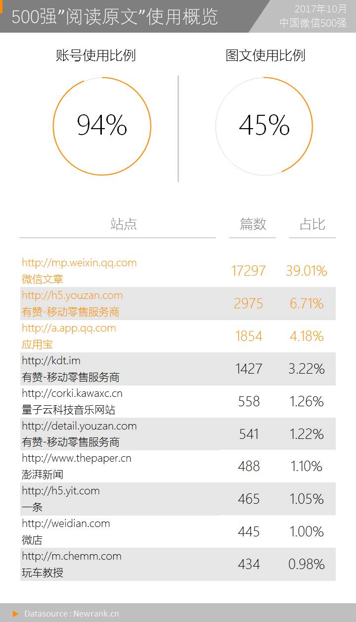 10月共有472个500强账号在44336篇内容中添加阅读原文链接,使用“阅读原文”位置的图文占比环比上升5%。三大引流渠道依旧为“微信图文”、“有赞商城”及“应用宝”。本月主要引流站点并未有所更替,“一条”和“有赞”使用率上升,而“微店”使用占比略有下跌。