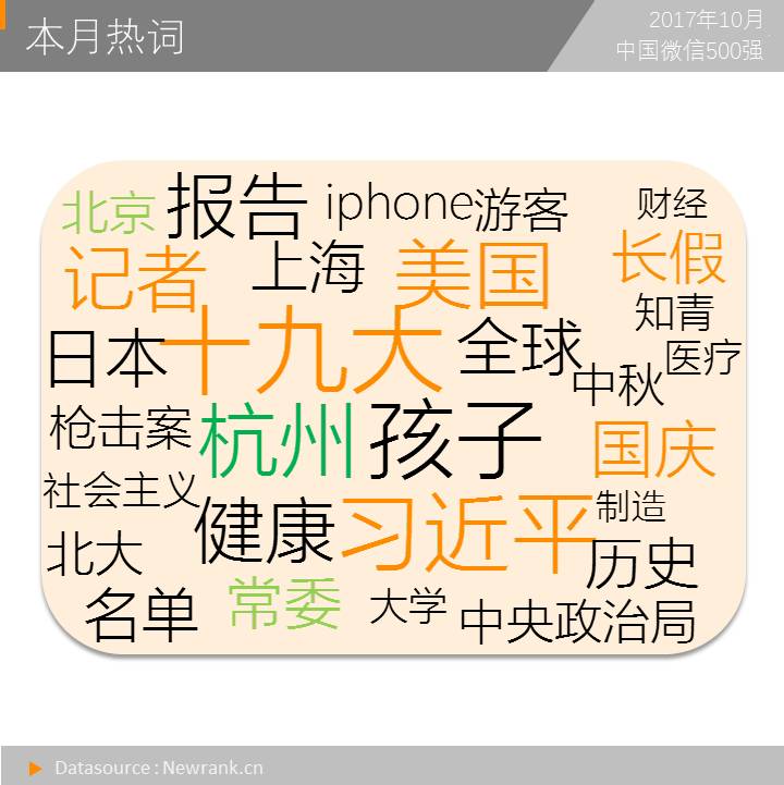 10月最强热点无疑为十九大,与之相关政策词汇均上榜,如:十九大、习近平、常委、报告、中央政治局等;除此之外,以下热点也备受关注:美国赌城枪击案、iPhone8与iPhone X的上市,撒贝宁调侃“北大还行”以及国庆中秋双节长假。
