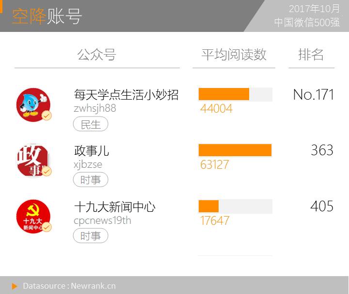 10月共有3个账号跻身空降榜,专注日常生活小窍门的民生类账号“每天学点生活小妙招”,新榜指数917.3,空降夺魁,位列171名;另两名为时事类账号,分别为新京报认证的“政事儿”和人民网认证的“十九大新闻中心”,前者以小细节解码大时政,平均单篇收获63127次阅读;后者为十九大新闻中心官方发布账号,10月11日开启第1次推送,平均每天推送4次,于10月26日完成十九大信息中枢的历史使命,停止发文。在16天的生命周期内累计发文223篇。