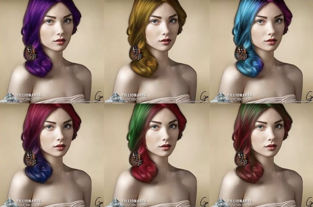 本文效果除了实现正常的单色染发,混合色染发之外,还实现了挑染,如最下方一组效果图所示。