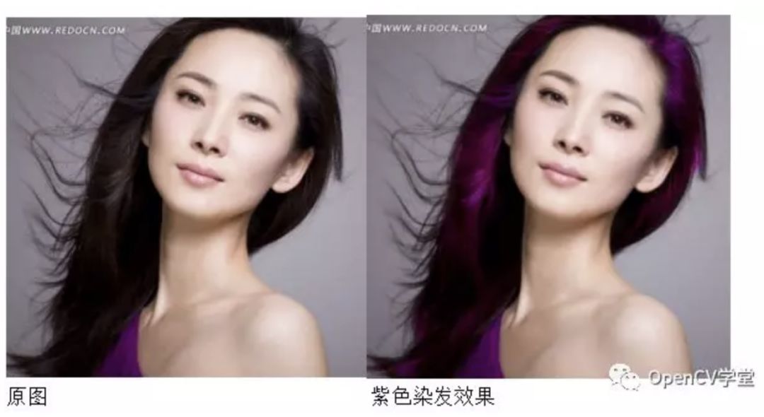 为什么要对头发的颜色进行增强与修正? 先看下面一组图,我们直接使用HSV颜色空间对纯黑色的头发进行染色,目标色是紫色,结果如下: