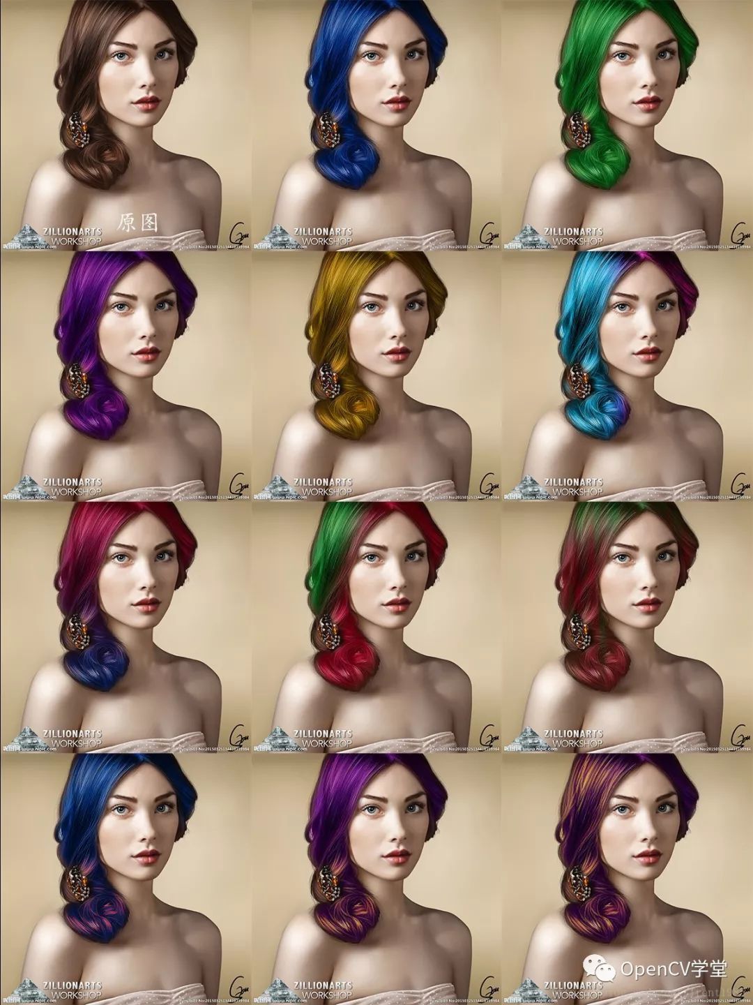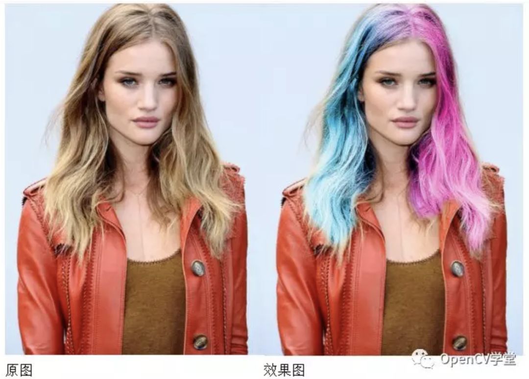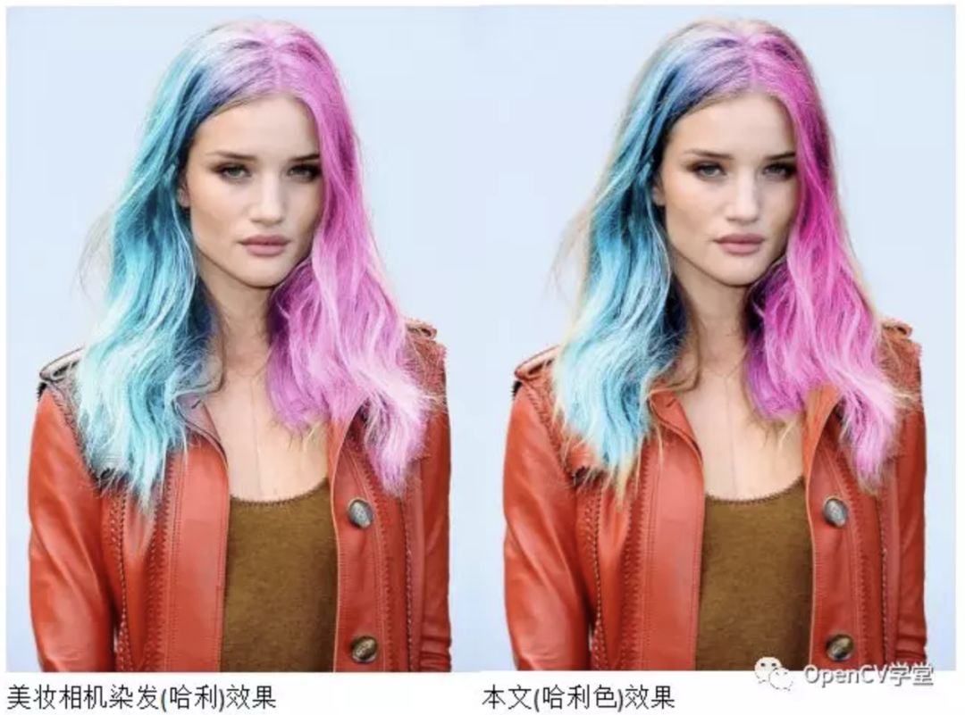 这一步主要是为了突出头发丝的细节,可以使用锐化算法,如Laplace锐化,USM锐化等等。上述过程基本是模拟美妆相机染发算法的过程,给大家参考一下,最后给出本文算法的一些效果举例: