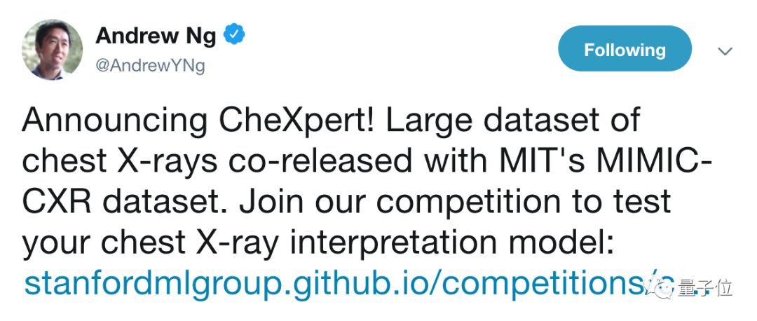 吴恩达老师发推宣布,一场疾病识别比赛已经开始了,欢迎大家带着自己的模型去参加。