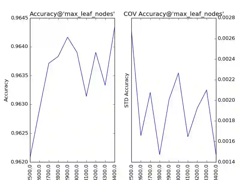 对“最大叶节点数”(max_leaf_nodes)以100为单位,设定取值范围为2500到3400,得到调参结果如下: