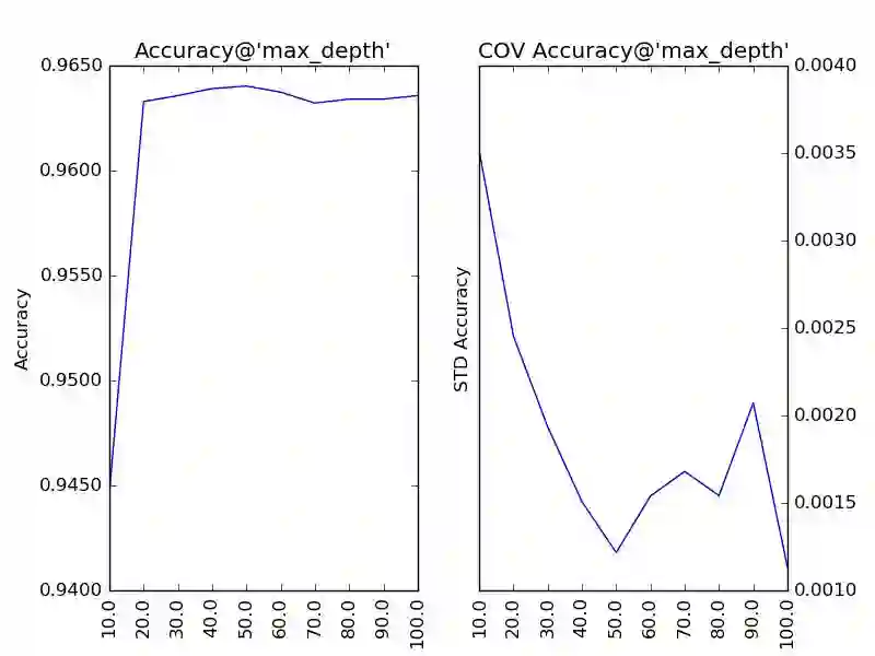 对“最大深度”(max_depth)以10为单位,设定取值范围为10到100,得到调参结果如下: