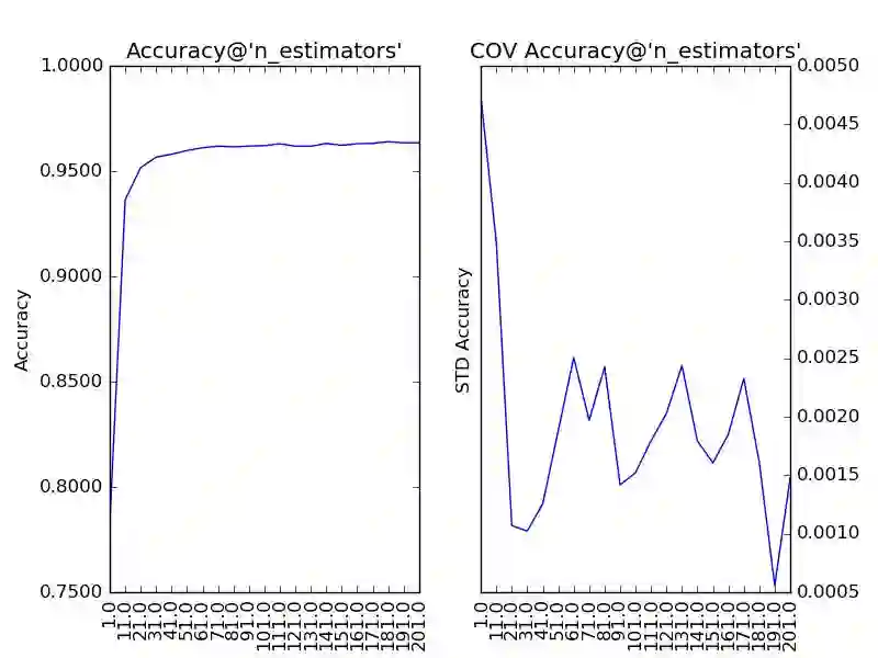 首先,我们需要对过程影响类参数进行调整,而Random Forest的过程影响类参数只有“子模型数”(n_estimators)。“子模型数”的默认值为10,在此基础上,我们以10为单位,考察取值范围在1至201的调参情况: