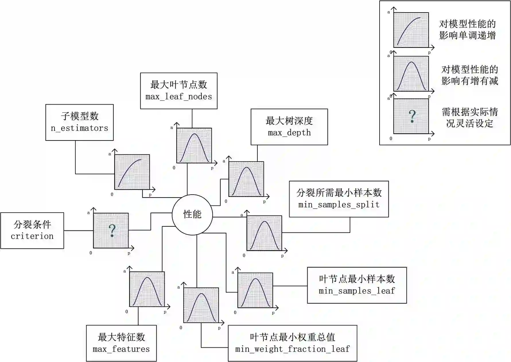 目前来说,在调参工作中,广泛使用的仍是一些经验法则。Aarshay Jain对Gradient Tree Boosting总结了一套调参方法,其核心思想在于:对过程影响类参数进行调整,毕竟它们对整体模型性能的影响最大,然后依据经验,在其他参数中选择对整体模型性能影响最大的参数,进行下一步调参。这种方法的关键是依照对整体模型性能的影响力给参数排序,然后按照该顺序对的参数进行调整。如何衡量参数对整体模型性能的影响力呢?基于经验,Aarshay提出他的见解:“最大叶节点数”(max_leaf_nodes)和“最大树深度”(max_depth)对整体模型性能的影响大于“分裂所需最小样本数”(min_samples_split)、“叶节点最小样本数”(min_samples_leaf)及“叶节点最小权重总值”(min_weight_fraction_leaf),而“分裂时考虑的最大特征数”(max_features)的影响力最小。
