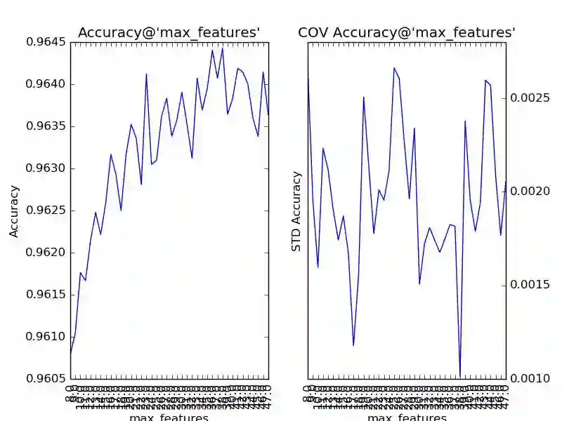 接下来,我们固定分裂时参与判断的最大特征(max_features)为38,在Kaggle上提交一次结果:0.96671,比上一次调参好了0.00171,基本与我们预期的提升效果一致。
