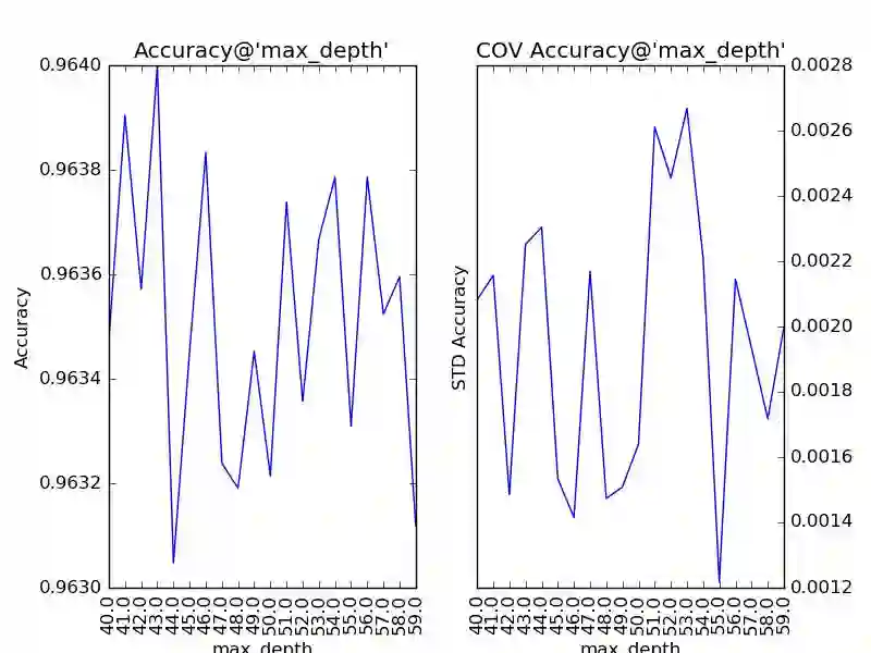 有点傻眼了,怎么跟预想的不太一样?为什么模型准确度的变化在40到59之间没有鲜明的“规律”了?要分析这个问题,我们得先思考一下,少一层子节点对子模型意味着什么?若少的那一层给原子模型带来的是方差增大,则新子模型会准确度提高;若少的那一层给原子模型带来的是偏差减小,则新子模型会准确度降低。所以,细粒度的层次变化既可能使整体模型的准确度提升,也可能使整体模型的准确度降低。从而也说明了,该参数更适合进行粗粒度的调整。在训练的现阶段,“抖动”现象的发生说明,此时对该参数的调整已不太合适了。
