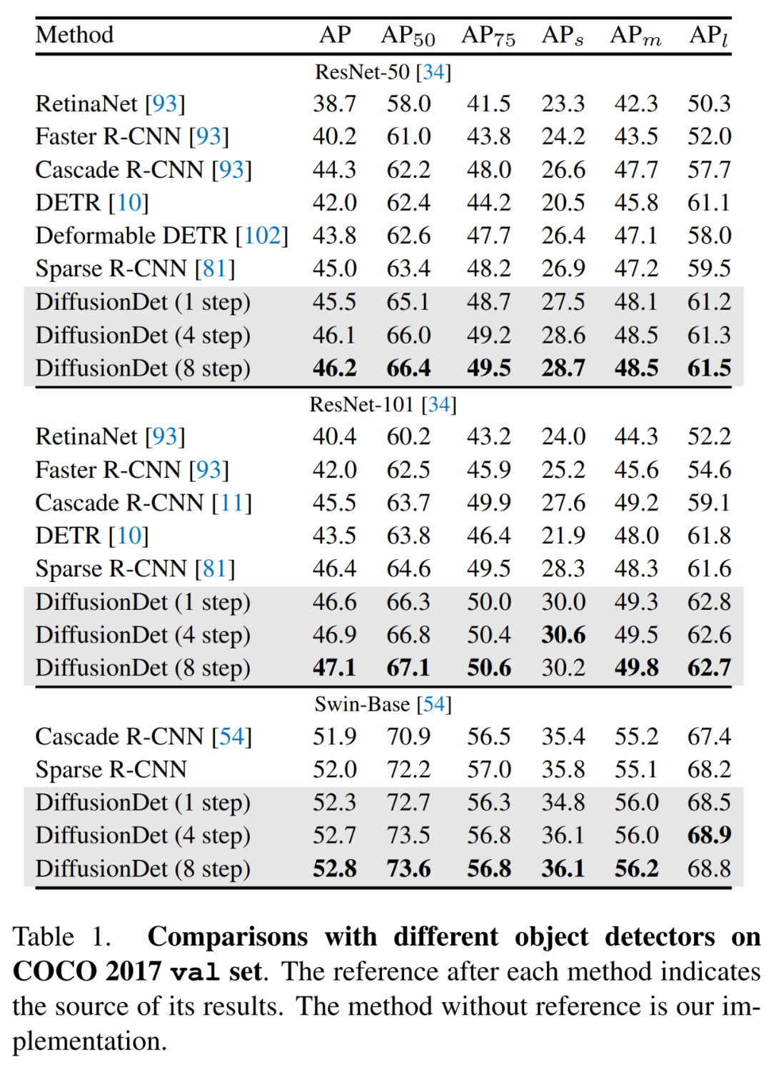 在实验部分,研究者首先展示了 DiffusionDet 的 Once-for-all 属性,然后将 DiffusionDet 与以往在 MS-COCO 和 LVIS 数据集上成熟的检测器进行比较。