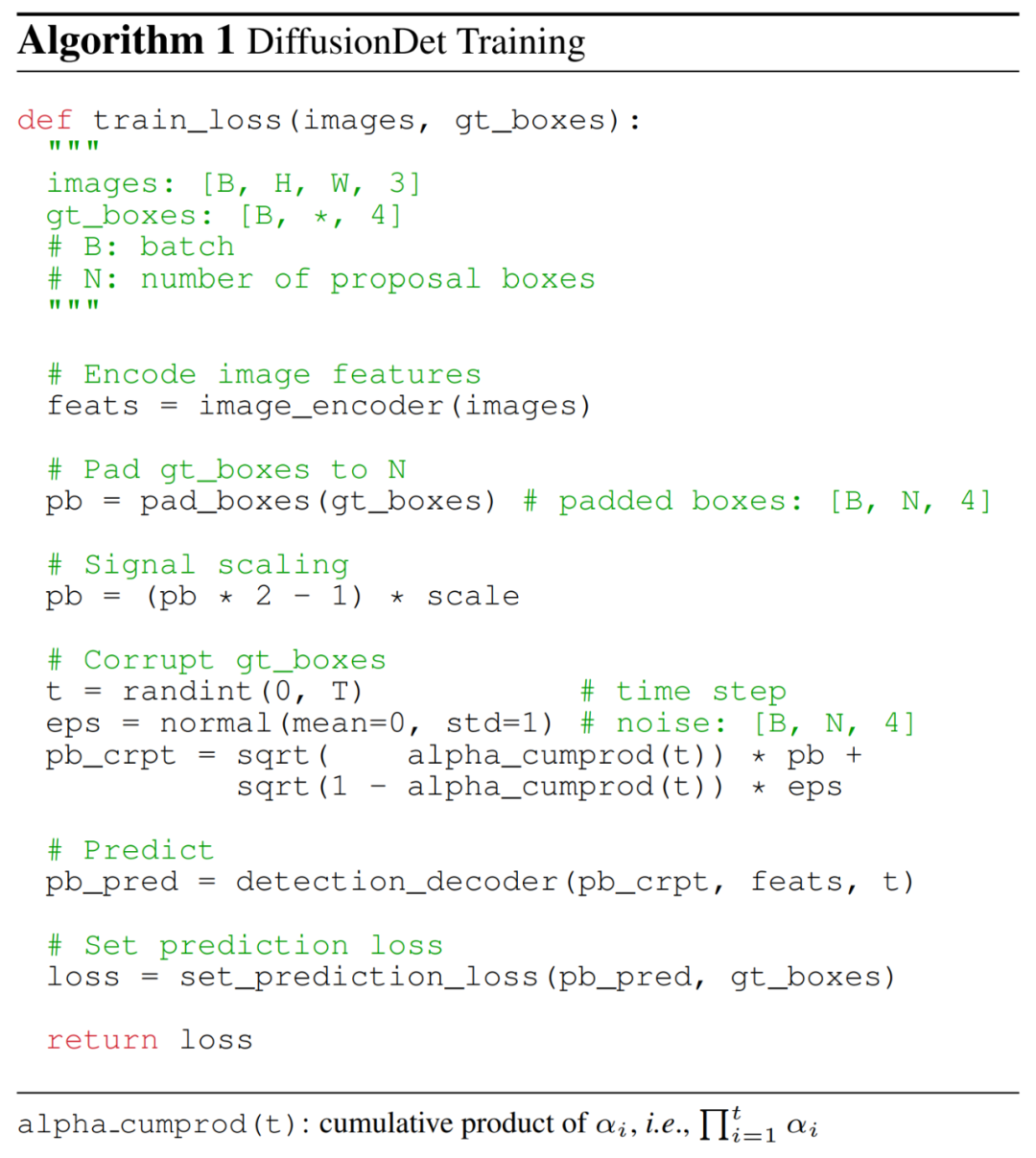 在训练过程中,研究者首先构建了从真值框到噪声框的扩散过程,然后训练模型来反转这个过程。如下算法 1 提供了 DiffusionDet 训练过程的伪代码。