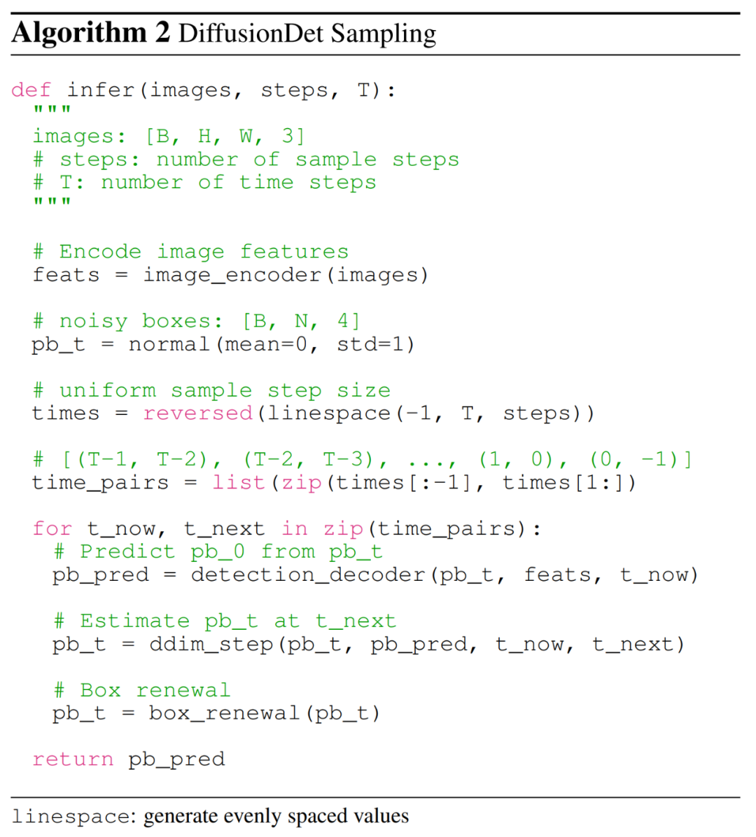 DiffusionDet 的推理过程是从噪声到目标框的去噪采样过程。从在高斯分布中采样的框开始,该模型逐步细化其预测,具体如下算法 2 所示。