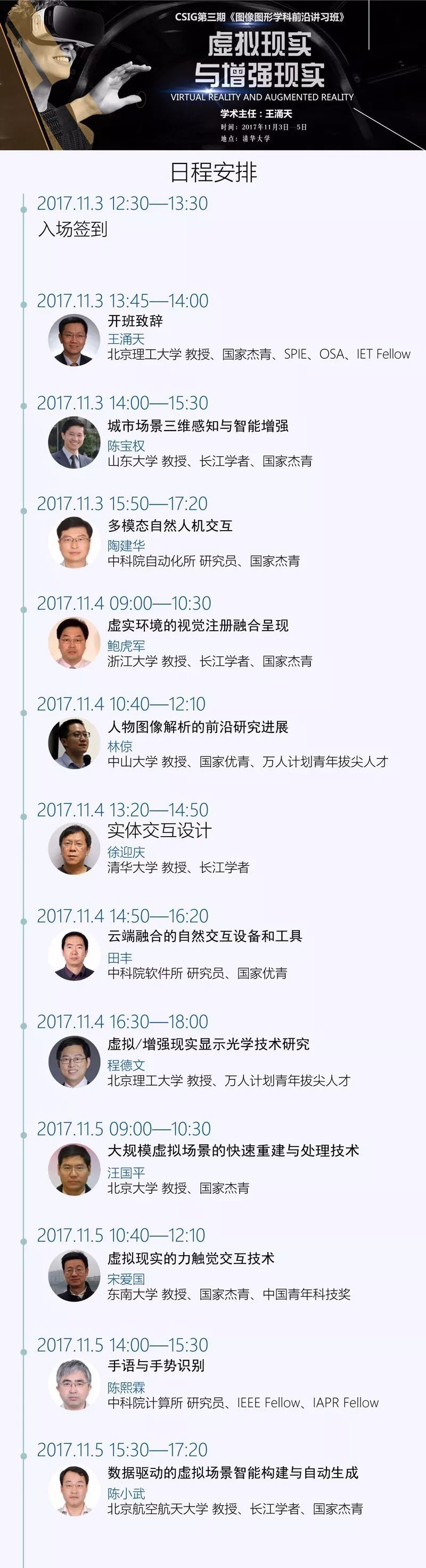2017年11月3日至5日,中国图象图形学学会将围绕“虚拟现实和增强现实”这一主题,在清华大学举办第三期“CSIG图像图形学科前沿讲习班”(Advanced Lectures on Image and Graphics,简称IGAL)。本期讲习班由北京理工大学混合现实与新型显示工程中心主任王涌天教授担任学术主任,邀请了国内虚拟现实与增强现实最顶尖的专家、学者,使学员在了解学科行业热点、提高学术水平的同时,增加与虚拟现实和增强现实顶尖学者之间的学术交流。