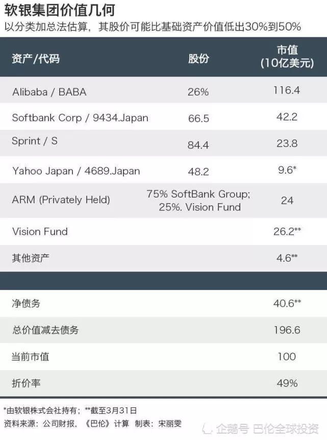软银并非真正意义上的企业集团,其结构也不是封闭式基金或基金管理业务。这只股票很便宜,超级便宜。以“分类加总法”估值,软银集团股价可能比基础资产价值低30%至50%。